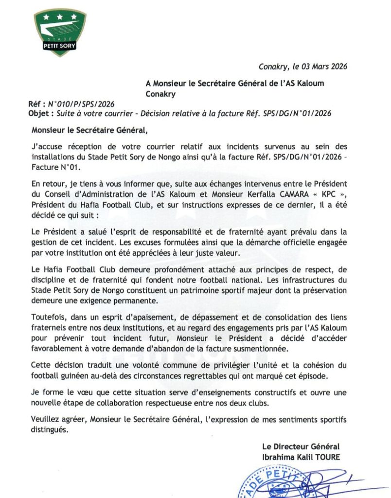 Faut-il le rappeler, cette somme devait être payée par la direction des Kaloumistes pour rembourser tous les frais liés aux dégâts matériels causés lors des incidents du match Hafia-ASK à Petit Sory de Nongo. A travers ce geste fort, KPC privilégie l’unité et la cohésion des acteurs du football guinéen. Pourvu que ce genres d’incidents déplorables ne se reproduisent plus jamais dans nos stades.